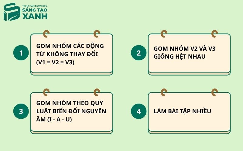 Việc phân loại bảng động từ bất quy tắc v1, v2, v3 thành các nhóm có đặc điểm tương đồng để giúp não bộ ghi nhớ thông tin một cách logic hơn. Phương pháp này không chỉ giúp nhớ lâu mà còn giúp bạn phản xạ nhanh hơn khi ứng dụng.