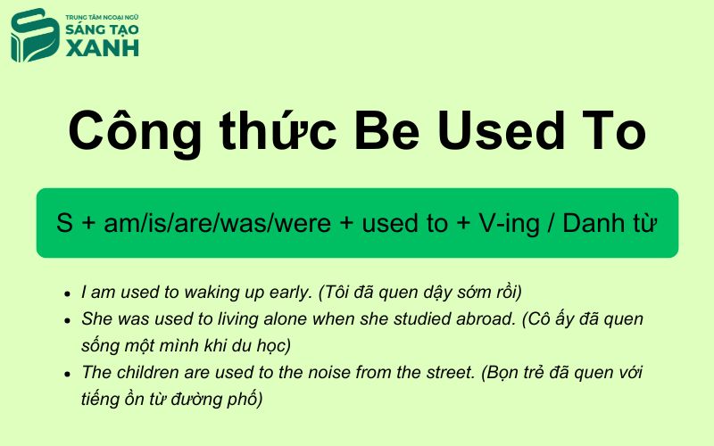 Ví dụ | I used to smoke. | I am used to working late. | I'm getting used to this. |