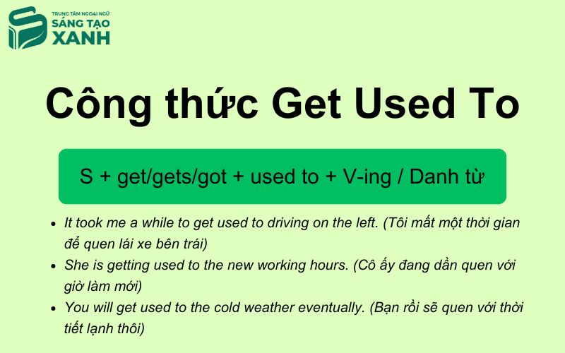Get used to là cấu trúc diễn tả quá trình làm quen với một điều gì đó, nhấn mạnh sự thay đổi đang xảy ra hoặc sẽ xảy ra. Không giống be used to, get used to tập trung vào hành trình chuyển đổi thay vì trạng thái đã hoàn thành. Công thức Get used to: