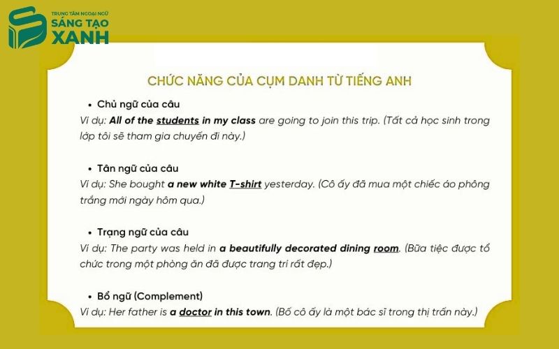 Cụm danh từ không chỉ đứng đơn thuần như một danh từ thông thường. Tùy vào vị trí trong câu, nó có thể đảm nhiệm nhiều chức năng ngữ pháp khác nhau.