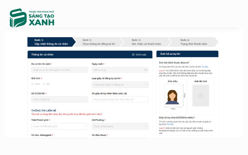 Thí sinh tiến hành nhập liệu chính xác các thông tin cá nhân bao gồm: Họ tên, Ngày sinh, Số CCCD/Hộ chiếu, Số điện thoại và Địa chỉ liên hệ. Tiếp theo, bạn sẽ tải lên file ảnh chân dung 3x4 và file ảnh chụp hai mặt của giấy tờ tùy thân đã chuẩn bị trước đó.