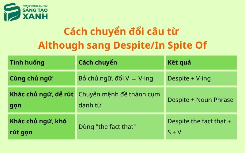 Khi chuyển đổi từ although sang despite hoặc in spite of, cần rút gọn mệnh đề thành cụm danh từ hoặc danh động từ. Có ba trường hợp chính.